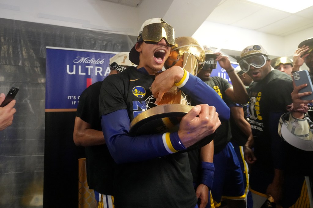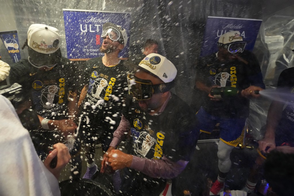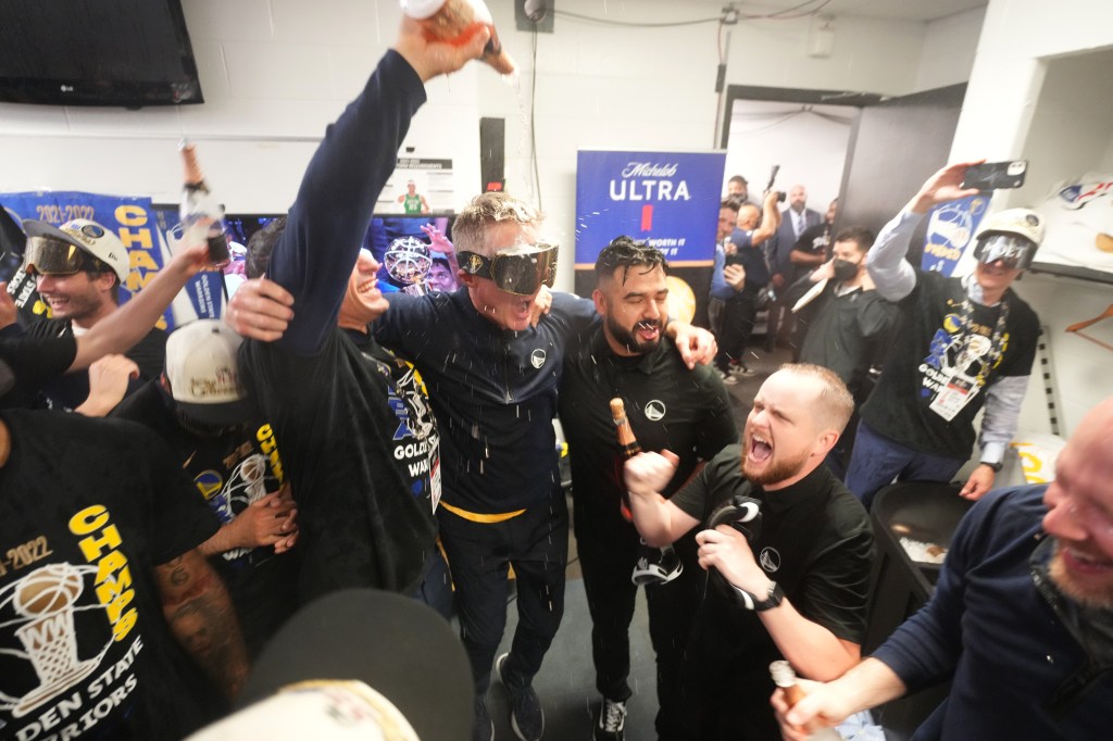 As for the Warriors roster, they started the party almost immediately with a champagne-soaked locker-room celebration, as is league tradition. And for the NBA’s 75th anniversary season, the league partnered with ESPN to supply Warriors players with official NBA Victory Goggles by Matador Project.