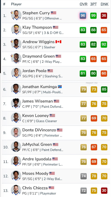 I’m also intrigued by the fact that Draymond Green, Andrew Wiggins, and Klay Thompson have identical ratings. That’s remarkable considering their completely different skill sets.